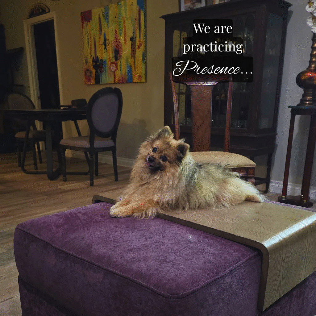 Care-giving has a way of pulling the veil off time. With my dog, Minky, the Now is simple because her body is honest. Her heart is enlarged, her breath sometimes falters, and the present moment speaks in clear, tender questions: Is it medicine time? Is it hound-honey time? Does she need my hand on her ribs while her lungs find their rhythm again? Does she just need calm because she can’t control what her body is doing? I don’t get to drift into theories with her. I get to listen. I match my breathing to hers, keep my awareness low and wide, and let love be practical. Animals don’t ask for our explanations; they ask for our presence. And in that presence they give something back — trust, softness, a wordless teaching about how to live at the speed of truth.