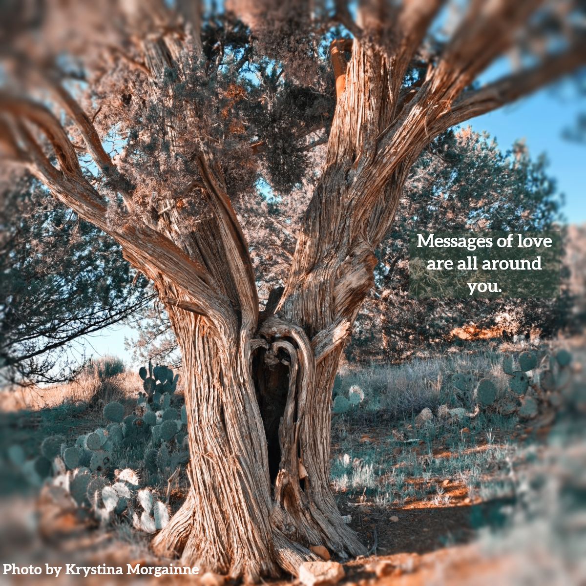 Throughout the journey I meditated, enjoyed Shamanic music and deeply entered Presence. The way forward was easy… watching the sun rise, seeing the topography change, filled with gratitude. As I explored the property, I came across this tree. It simply amplified the love I was already experiencing in this sacred place as I felt power swirl around me, lifting me into another level of awareness.