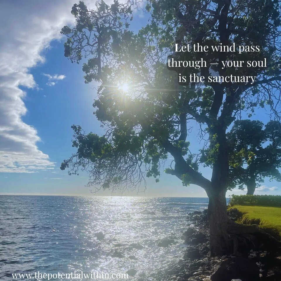In my corner of the world, the wind is blowing tonight — great gusts of pure energy that feel like both a test and a cleansing. I’m safe and warm in my sacred space, listening to the weather speak its wild truth outside my walls. And so it is with life. We can create a sacred space within us that offers shelter through the storms of experience. Not a place that avoids the winds, but a place that knows how to stand steady while they pass.